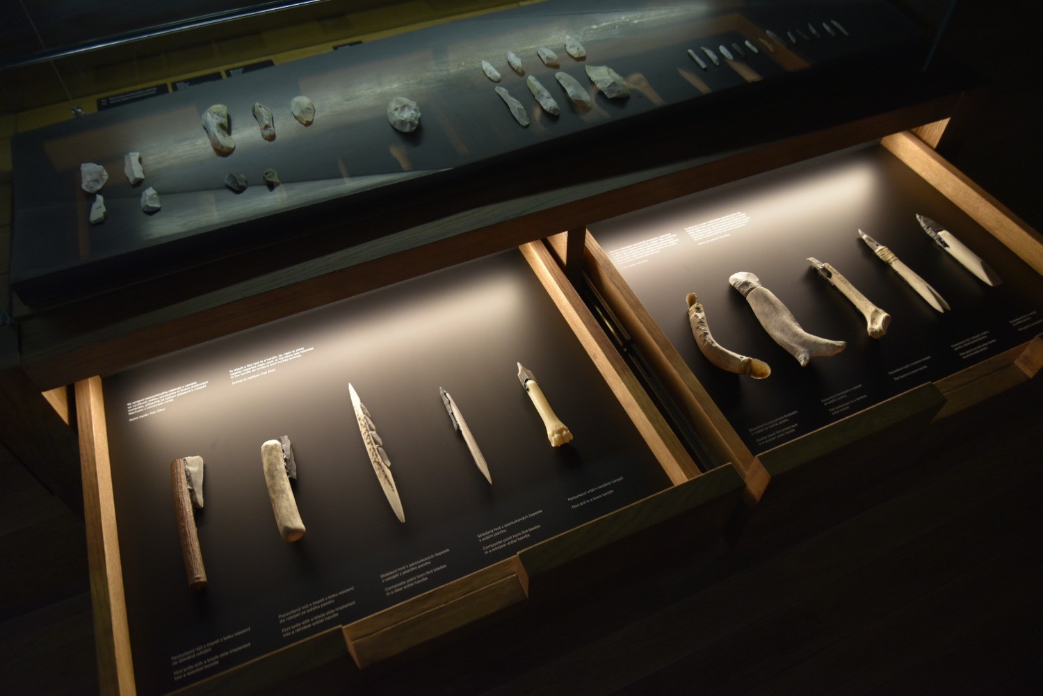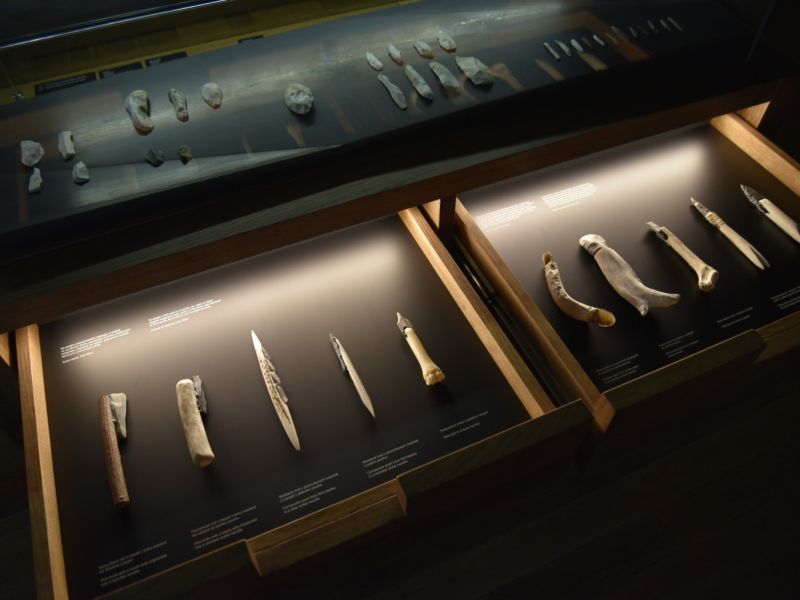 V unikátní podzemní architektuře, zasahující až na úroveň nálezových vrstev, jsou vystaveny kamenné a kostěné nástroje používané v každodenním životě i při lovu, replika dolnověstonického hrobu tří mladých jedinců přibližuje pohřební rituály a vystavené umělecké předměty, například sošky venuší a plastiky zvířat, ukazují estetické cítění pravěkých lidí.